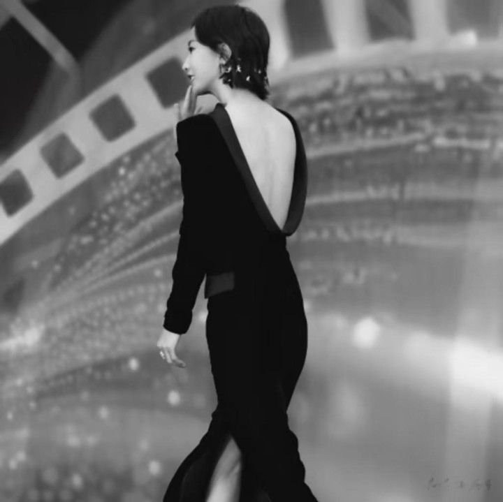 黑色丝绒的质感给人一种高贵、优雅的感觉,而露背的设计则巧妙地增添了一丝性感和时尚元素,使她的整体造型既不失稳重又充满了魅力。